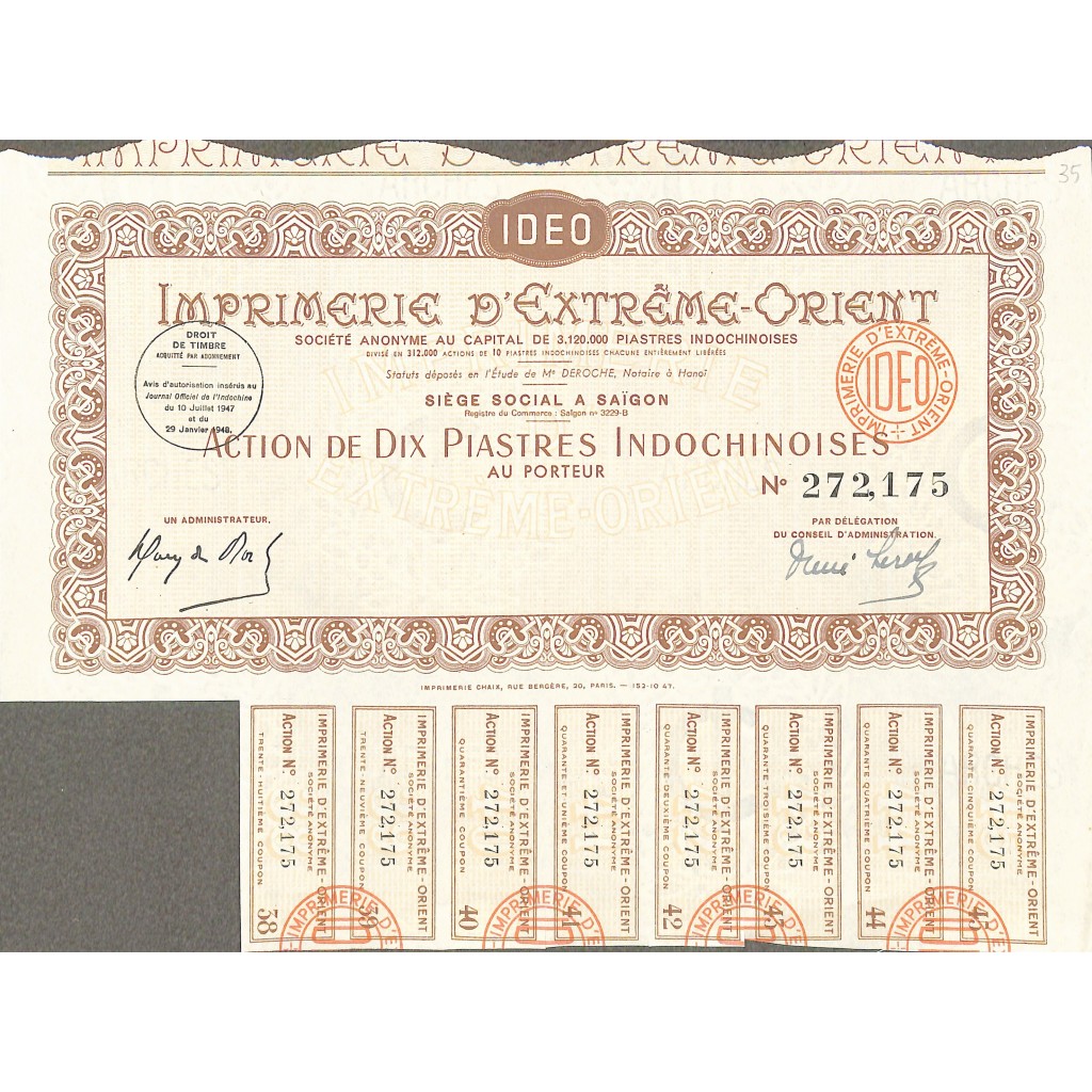 Una azione al portatore del valore di 10 Dollari indocinesi.