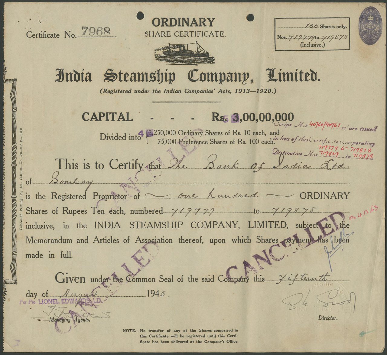 A-41802India Steamship Company Limited-1British India1945ordinary shareR1 (Più di 5000 pezzi)S1 (da 0 a 25 €)