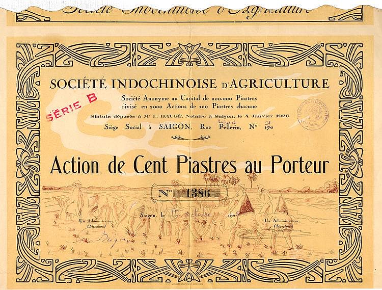 Sullo sfondo immagine stilizzata con agricoltori intenti alla semina del riso. All'epoca Saigon era capitale della colonia francese dell'Indocina.