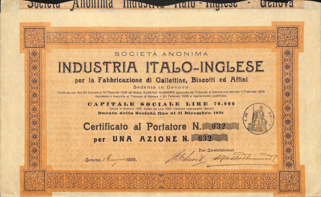 A-6978Industria Italo-Inglese per la Fabbricazione di Gallettine, Biscotti ed Affini-1N.D.Genova19091 azione da Lire 100R2 (1001-5000 pezzi)S3 (da 51 a 100 €)