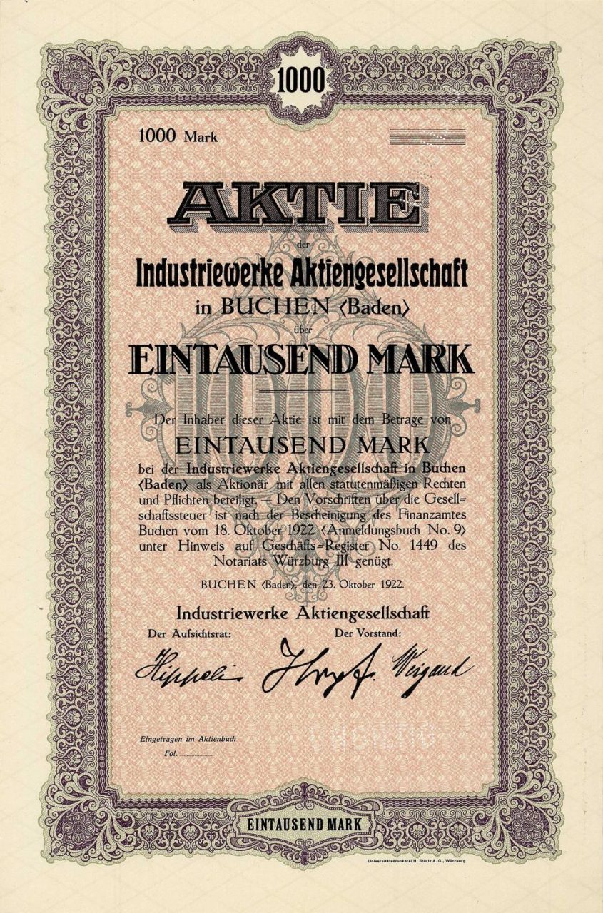 A-63894Industriewerke AG in Buchen-1Buchen19221 azione da 1.000 MarchiR4 (251-500 pezzi)S4 (da 101 a 250 €)