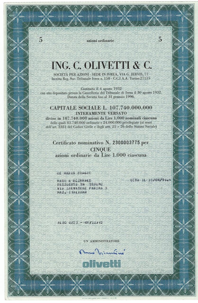 L’ingegner Camillo Olivetti (1868-1943) iniziò a Ivrea nel 1896 la sua attività in una piccola officina, costruendo strumenti elettrici di misura. Nel 1908 dette avvio alla costruzione delle prime macchine da scrivere italiane che apparvero sul mercato nel 1911.