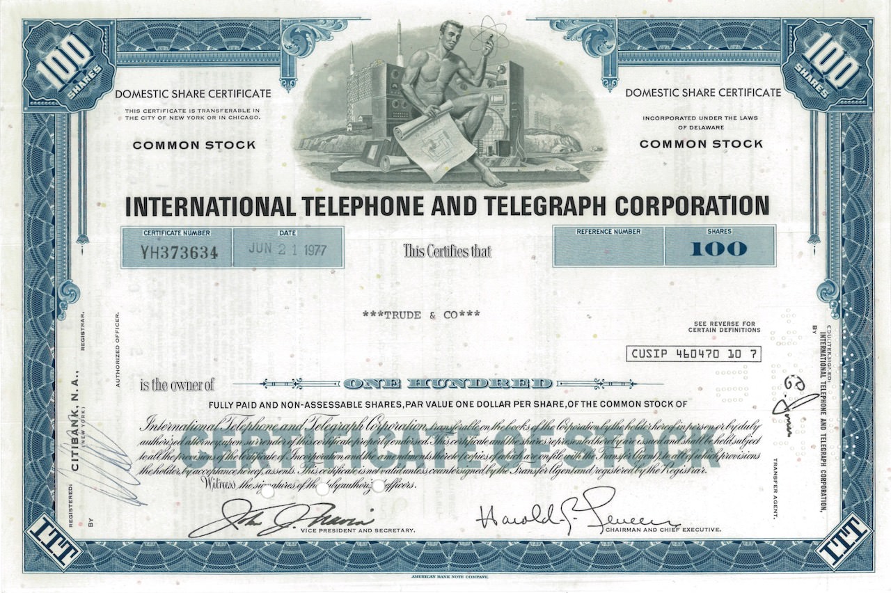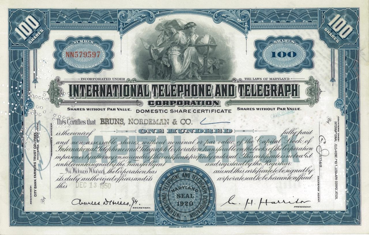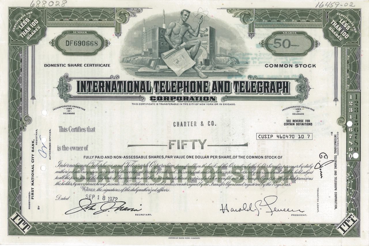 A-18592International Telephone and Telegraph Corporation-1American Bank Note Company - New York1950100 azioniR1 (Più di 5000 pezzi)S1 (da 0 a 25 €)