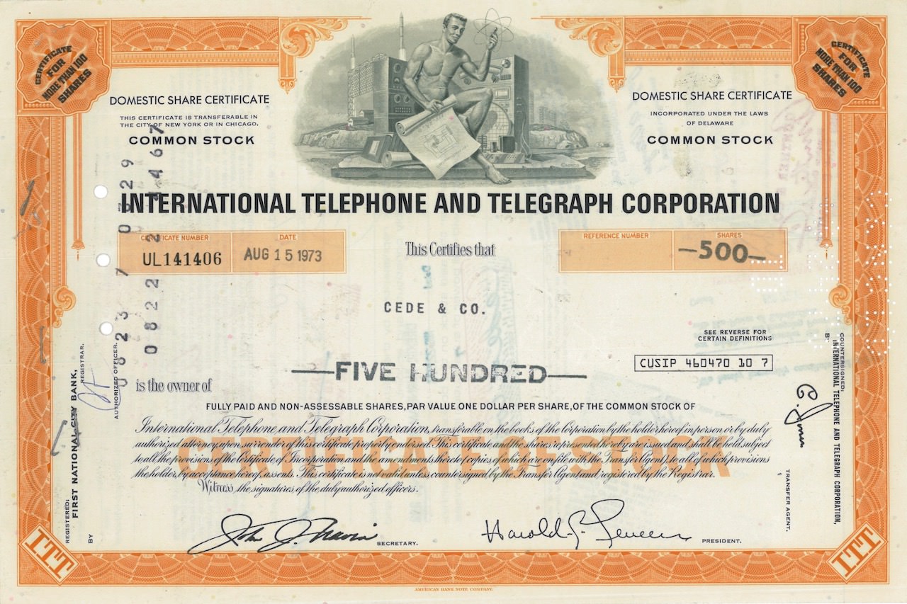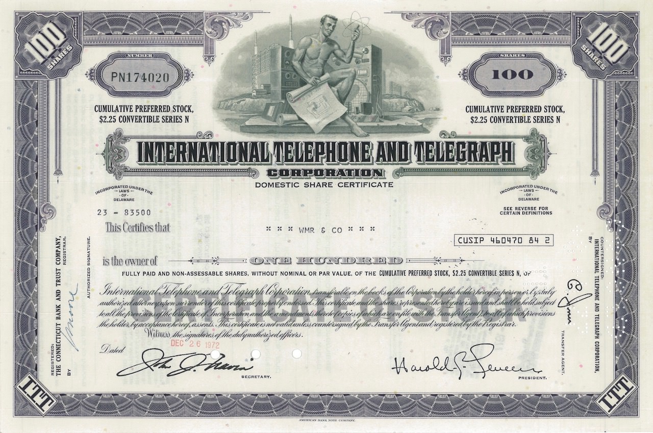 D-18592International Telephone and Telegraph Corporation-4American Bank Note Company - New York1972100 azioniR1 (Più di 5000 pezzi)S1 (da 0 a 25 €)