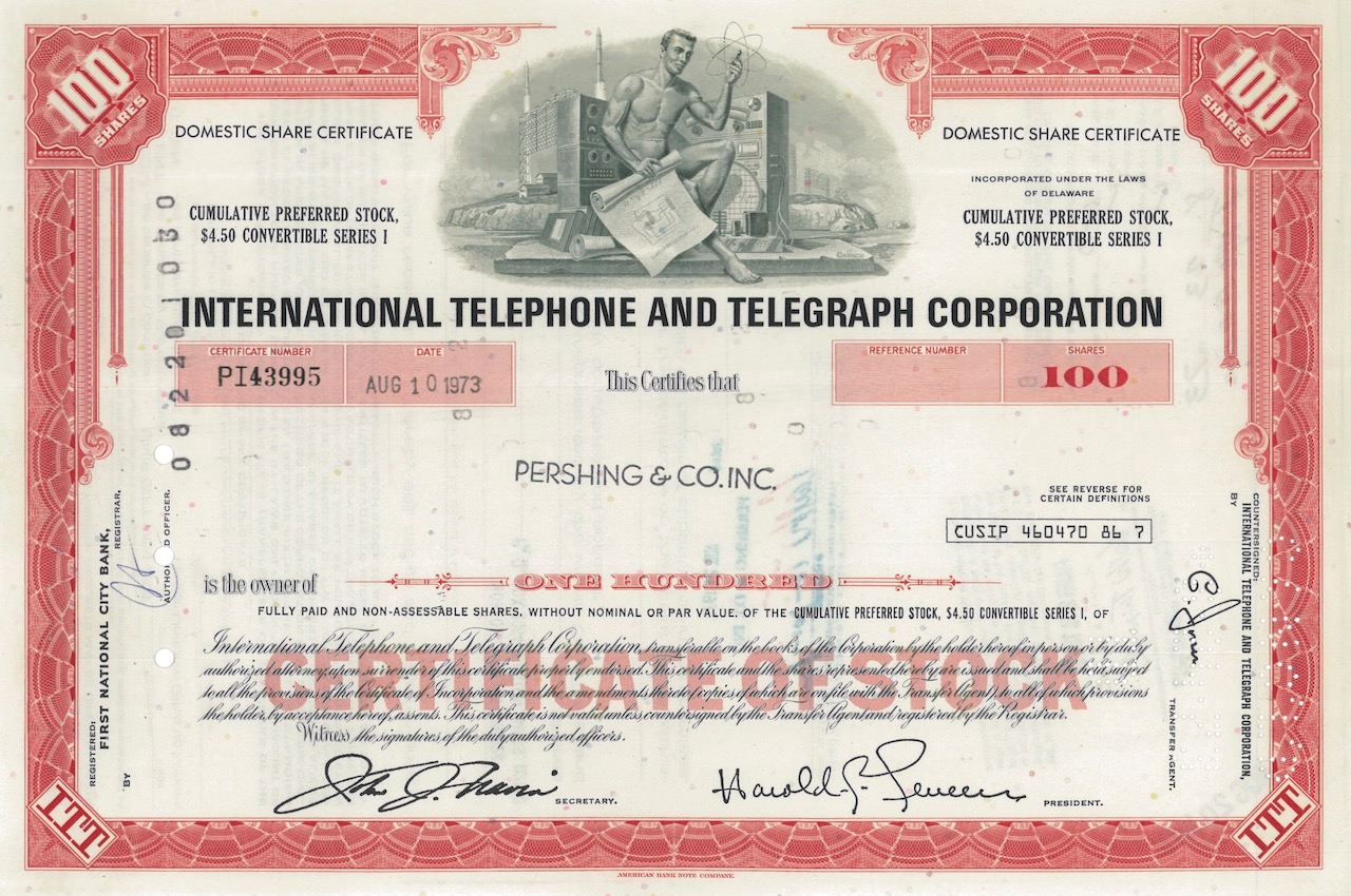 G-18592International Telephone and Telegraph Corporation-7American Bank Note Company - New York1973100 azioniR1 (Più di 5000 pezzi)S1 (da 0 a 25 €)