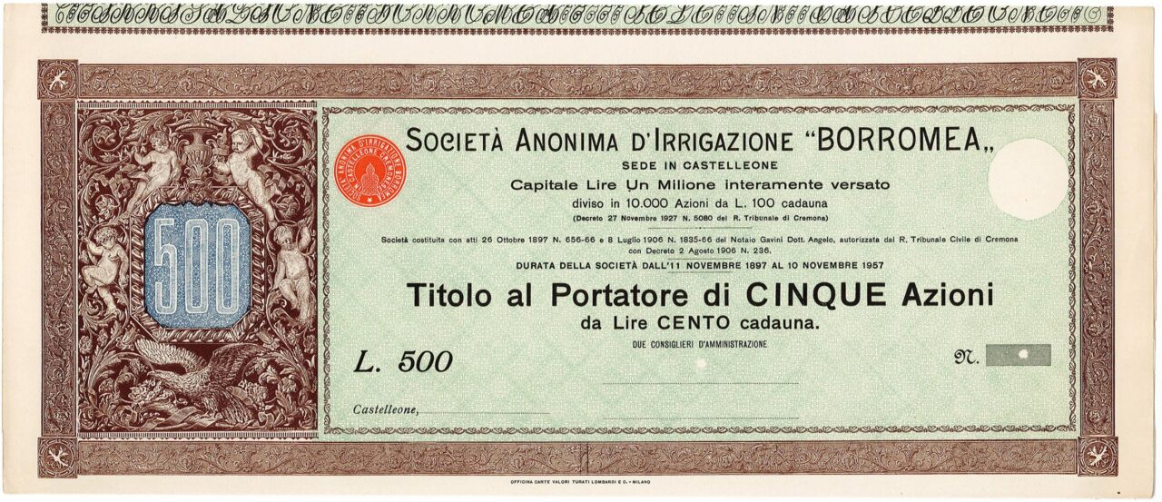 A-85377Irrigazione Borromea Soc. Anon.-1Officina Carte Valori Turati Lombardi e C. - MilanoCastelleone1927titolo al portatore di 5 azioni da 100 LireR3 (501-1000 pezzi)S2 (da 26 a 50 €)