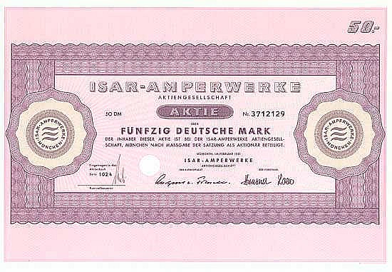 Fondata nel 1908 con l’acquisizione di “Industrielle Unternehmungen GmbH” e “Süddeutsche Wasserwerke AG”. A quel tempo, due centrali idroelettriche e una centrale a vapore alimentavano 24 città con ca. 3.000 clienti di energia elettrica. Negli anni 1909/10 avvio delle centrali idroelettriche di Unterbruck e Kranzberg, nel 1923 fondazione della “Neue Amperkraftwerke AG, München” per la costruzione della centrale idroelettrica di Haag. Nel 1932, questa joint venture, come la “Bayerische Überlandzentrale AG, Monaco”, si fonde in Amperwerke, il cui principale azionista era la Society for Electrical Enterprises (Gesfürel) di Berlino. II Isarwerke AG: fondata nel 1921 come filiale della Isarwerke GmbH (fondata nel 1894 con la partecipazione significativa della famiglia bancaria von Finck) per costruire la centrale idroelettrica Mühltal. Nel 1952, la AG ha rilevato l’intera attività elettrica della GmbH, che ora era attiva solo come holding. Successivamente fu aggiunta una centrale a vapore e una seconda centrale idroelettrica fu costruita a Pullach an der Isar nel 1902-04. III. Isar-Amperwerke AG: nel 1955 si fondono Amperwerke AG e Isarwerke AG. Negli anni 1954-56 ampliamento delle centrali a vapore di Höllriegelskreuth e Zolling-Anglberg. Anche la centrale a vapore di Irsching (1969), la centrale nucleare di Essenbach bei Landshut (1977, con il partner Bayernwerk), la centrale nucleare di Isar I (1979) e la centrale nucleare di Isar II (1988). Inizialmente oltre i 3/4, in seguito quasi il 50% del capitale di Isar-Amperwerke era detenuto da Isarwerke GmbH (che a sua volta era posseduta al 45% da Merck, Finck & Co. a Monaco, al 25% da RWE e al 10% da Allianz). Nel 2000 Bayernwerk e PreußenElektra si sono fuse per formare E.ON Energie AG. Questa ora possedeva direttamente e indirettamente la maggioranza dei tre quarti della Isar-Amperwerke AG, che nel 2001 fu ribattezzata E.ON Bayern AG. Allo stesso tempo, le precedenti grandi aziende del Bayernwerk (compresa la centrale terrestre della Bassa Franconia, la fornitura di energia della Baviera orientale, la fornitura di energia della Alta Franconia, la centrale di Norimberga, ecc.) sono state introdotte in E.ON Bayern AG. Ancora quotato in borsa oggi.