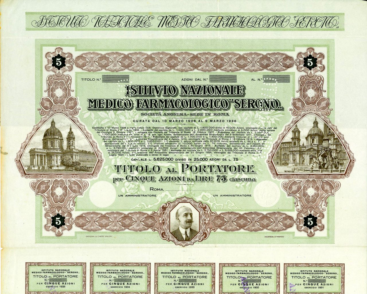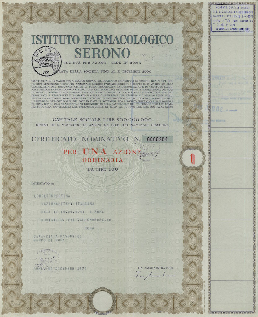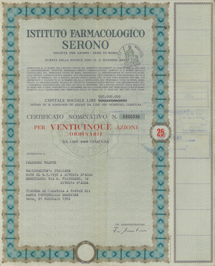 L’Istituto nazionale medico-farmacologico della Serono venne fondato a Torino il 10 marzo 1906 dal prof. Cesare Serono che, con l’aiuto del presidente dell’Istituto, principe senatore Prospero Colonna, divenne presidente dell’Unione Industriali del Lazio e, negli anni venti, effettuò degli ampliamenti alla struttura della fabbrica. Serono fu deputato della Camera durante la XXVIII e la XXIX legislatura del Regno d’Italia.