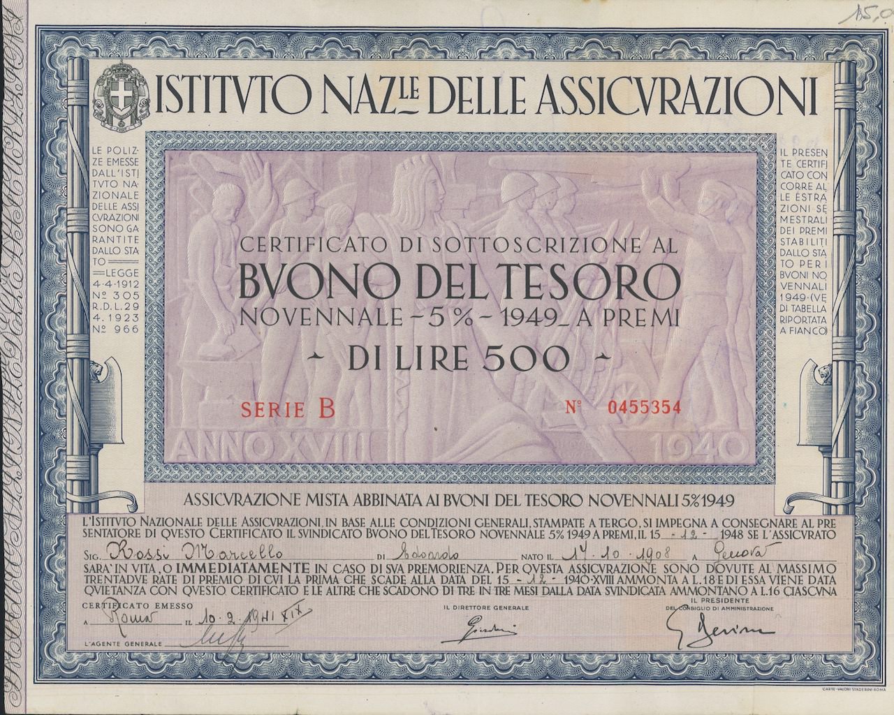 A-15583Istituto Naz.le delle Assicurazioni – BTP Novennale 5% – 1949-1Cosenza1940500 lire (serie B)VerdeR3 (501-1000 pezzi)S3 (da 51 a 100 €)
