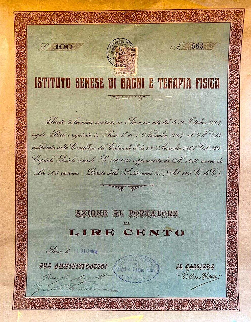 A-46538Istituto Senese di Bagni e Terapia Fisica S.A.-1Siena19081 azione di fondazione al portatore da Lire 100R2 (1001-5000 pezzi)S3 (da 51 a 100 €)