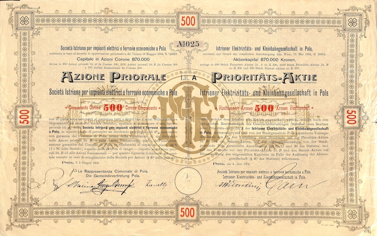 A-7456Istriana per Impianti Elettrici e Ferrovie Economiche a Pola Soc.-1Tip. Del Lloyd austr. In TriestePola19041 azione da 500 CoroneR2 (1001-5000 pezzi)S3 (da 51 a 100 €)