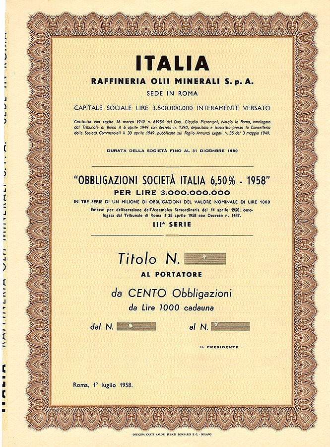 A-46645Italia Raffineria Olii Minerali S.p.A.-1Roma1958100 obbligazioni 6,5% al portatore da Lire 1.000 (specimen)R2 (1001-5000 pezzi)S2 (da 26 a 50 €)