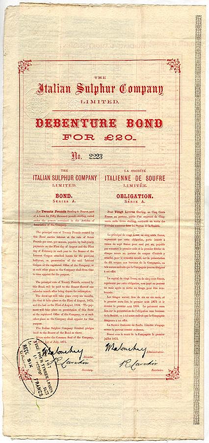 A-46651Italian Sulphur Company-1Forlì-Cesena18751 obbligazione 7% al portatore da 20 Lire SterlineR3 (501-1000 pezzi)S3 (da 51 a 100 €)