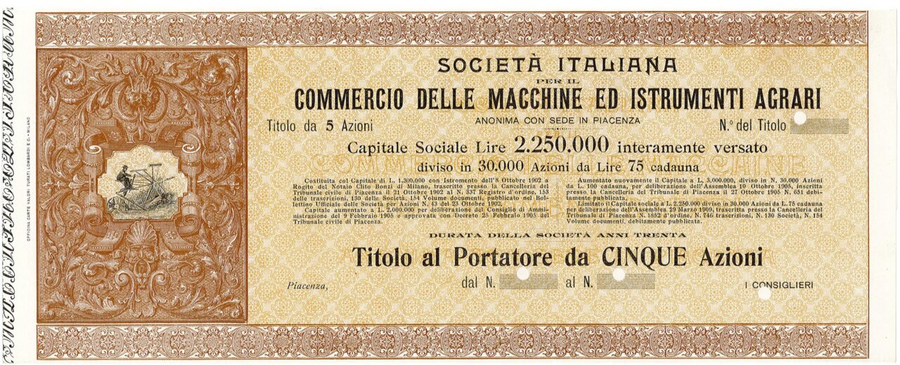 B-46699Italiana per il Commercio delle Macchine ed Istrumenti Agrari Soc. SIMA-2Piacenza19035 azioni da Lire 75R3 (501-1000 pezzi)S4 (da 101 a 250 €)