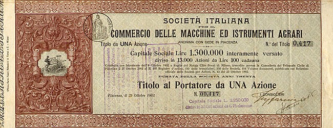 A-46699Italiana per il Commercio delle Macchine ed Istrumenti Agrari Soc. SIMA-1Piacenza19031 azione di fondazione da Lire 100R3 (501-1000 pezzi)S4 (da 101 a 250 €)