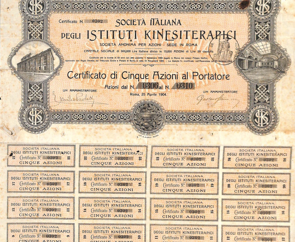 B-4386Italiana degli Istituti Kinesiterapici Soc.-2Lit. A Marzi – RomaRoma19045 azioni da Lire 100R7 (26-50 pezzi)S4 (da 101 a 250 €)