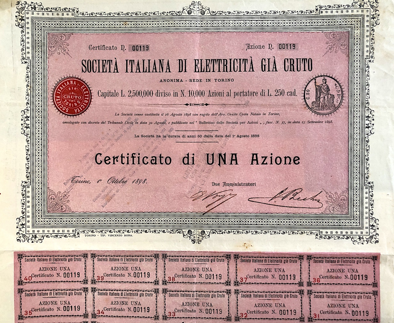 A-37724Italiana di Elettricità già Cutro-1Torino18981 Azione da lire 250R6 (51-100 pezzi)S4 (da 101 a 250 €)