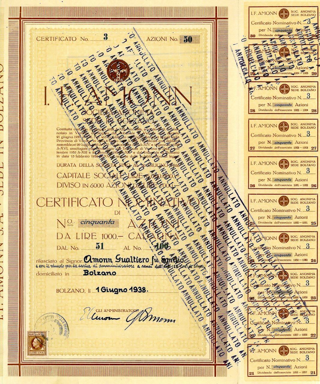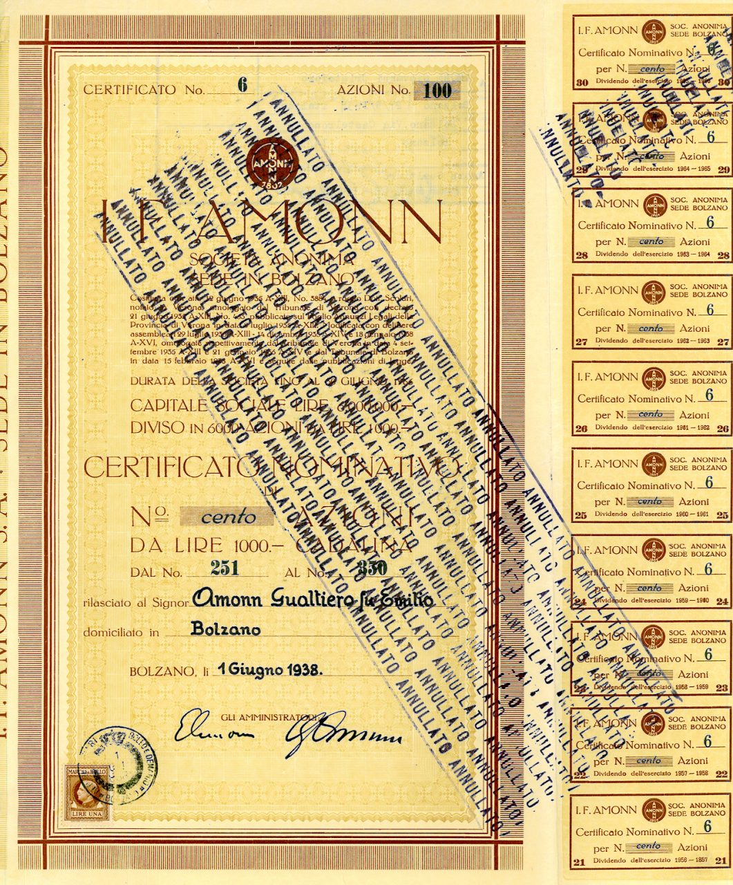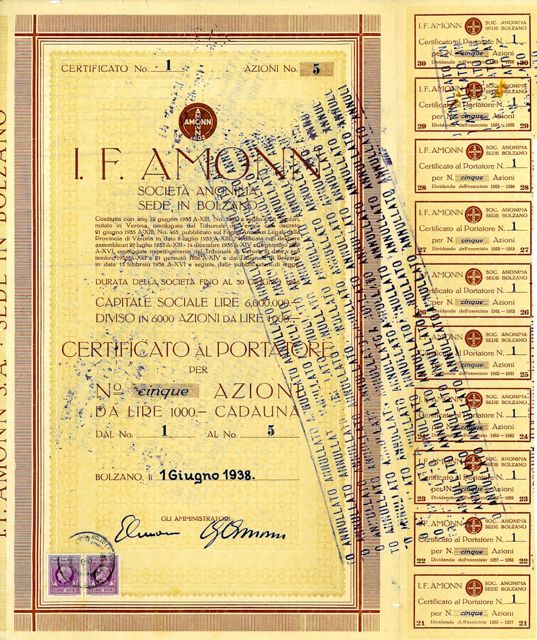 Nel 1913 l’azienda passa nelle mani di Erich e Walter Amonn. Nel 1921 viene acquistata una legatoria e aperto un negozio di colori, mentre nel 1931 si costruisce una fabbrica di prodotti chimici per l’agricoltura. Con l’arrivo della guerra, nel 1943 le attività vengono trasferire a Merano, Terlano e Appiano località ritenute più sicure. Infatti nel 1944 a Bolzano la sede sociale viene colpita dai bombardamenti, e verrà ricostruita nel 1946. Nel 1952 la J.F. AMONN Società per Azioni festeggia il 150° anno di fondazione e aumenta a cento milioni di lire il proprio capitale sociale, che negli anni Trenta e Quaranta, come Società Anonima, era prima di cinque milioni e poi di sei milioni di lire.
