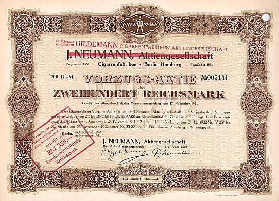A-67228J. Neumann AG (Gildemann Cigarrenfabriken AG)-1Berlino19241 azione di preferenza da 200 Marchi--