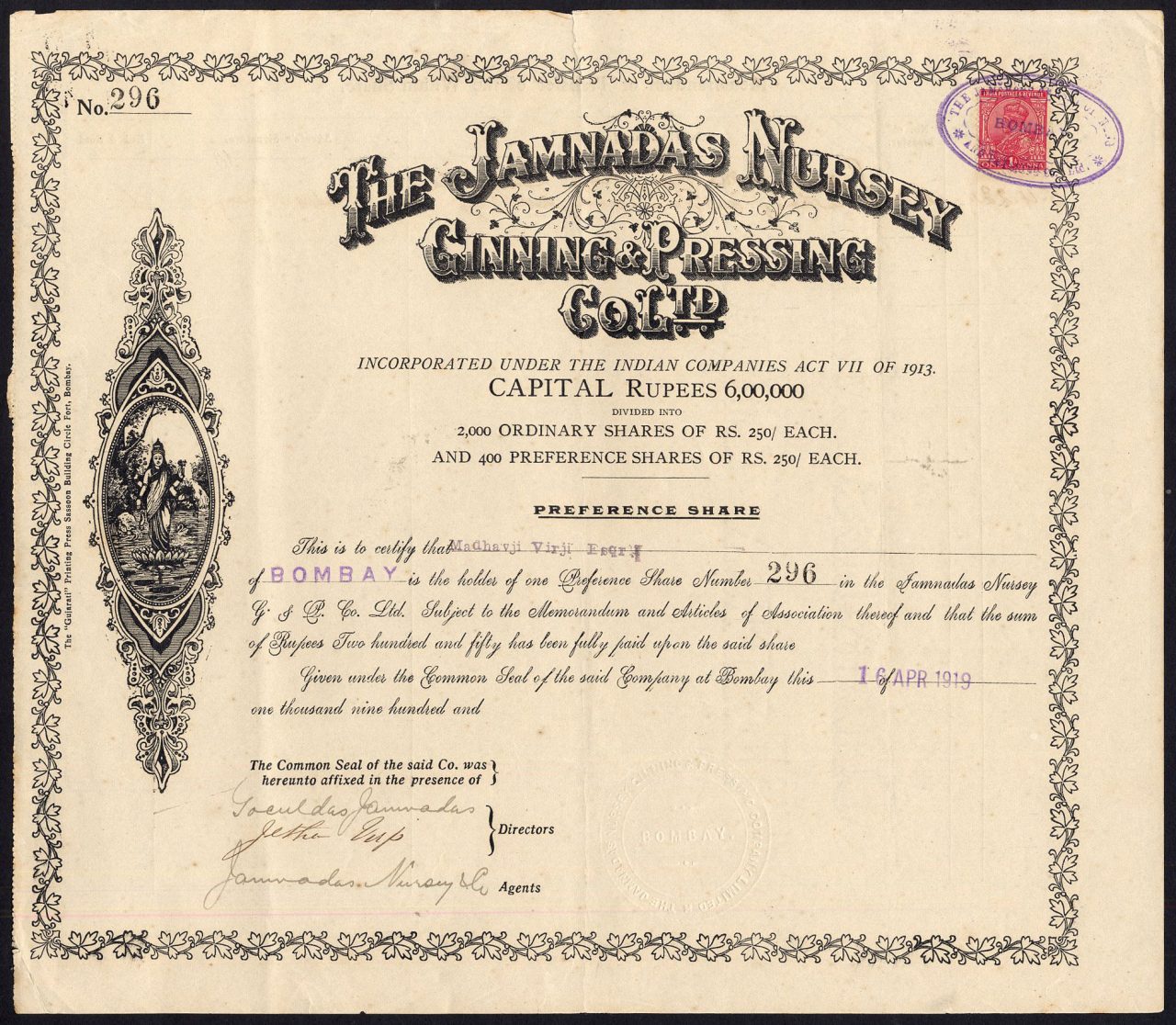 A-42377Jamnadas Nursey Ginning & Pressing Co. Ltd.-1British India1919preference sharesR2 (1001-5000 pezzi)S2 (da 26 a 50 €)