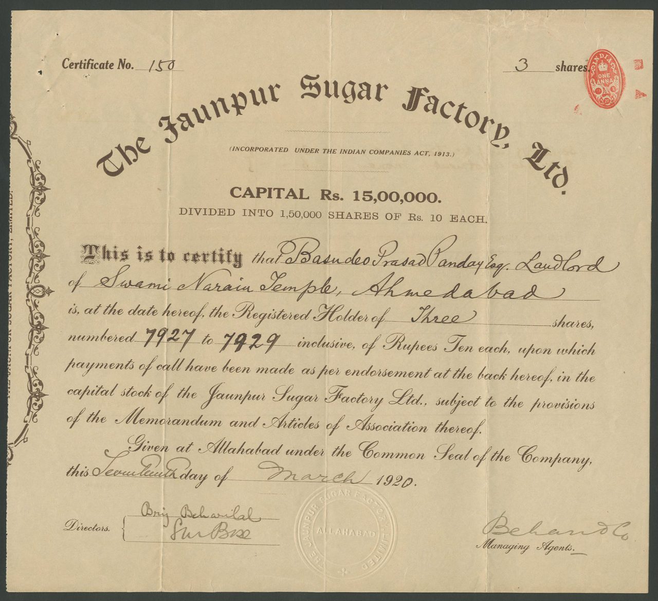 Incorporato sotto l’Indian Companies Act 1913. Capitale 15.00.000 rupie in 1.50.000 azioni di 10 rupie.