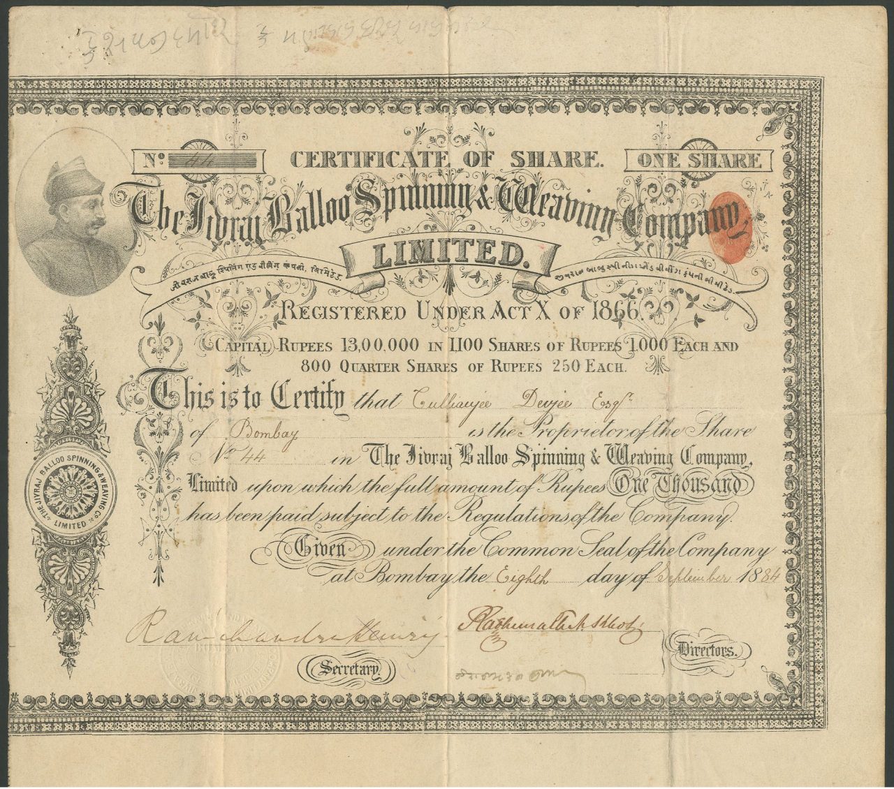 Incorporato sotto gli Indian Companies Acts 1866. Capitale 13.00.000 rupie in 1100 azioni di 1000 rupie e 800 quarti di azioni di 250 rupie.