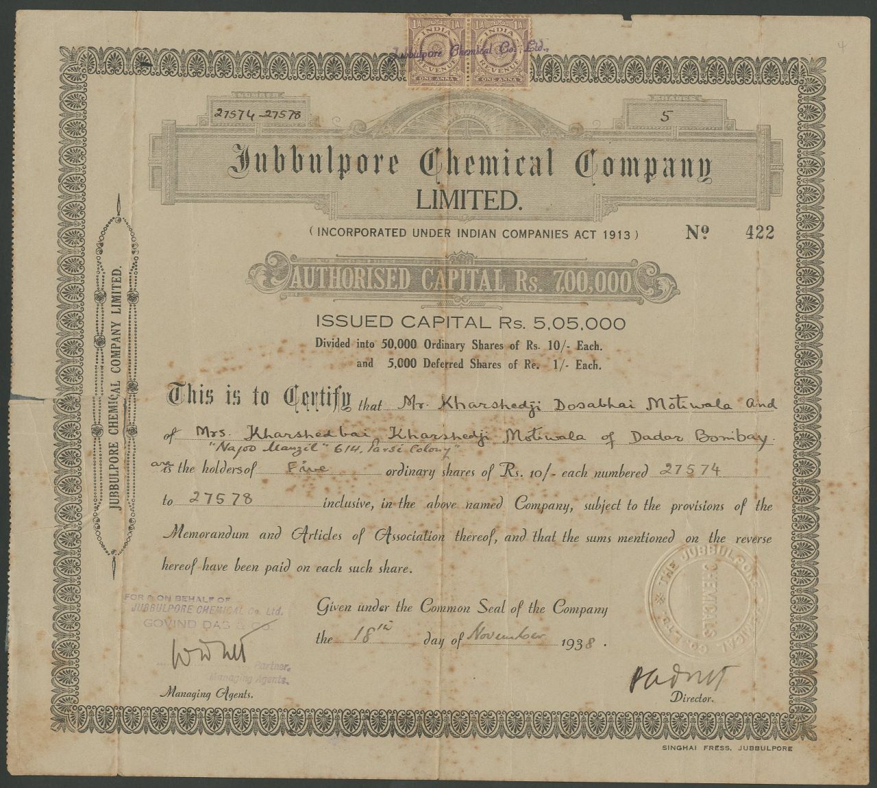 A-42433Jubbulpore Chemical Company Limited-1British India1938ordinary sharesR1 (Più di 5000 pezzi)S1 (da 0 a 25 €)