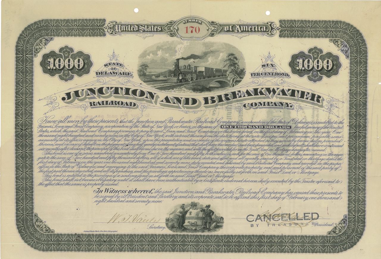 Classico bond ferroviario americano con veste grafica molto apprezzabile: nostalgica vignetta di un treno in corsa, trainato da una locomotiva a vapore alimentata a legna, ed emblema dello Stato di Delaware. La compagnia, creata nel 1857, costruì ed esercitò la linea ferroviaria per collegare Milford, Lewes e Georgetown nello Stato di Delaware, abbandonata poi negli anni Settanta del Novecento. Nel 1883 fu assorbita dalla Delaware Maryland & Virginia RR, entrando a far parte del dilagante sistema della Pennsilvanya RR, che gestiva tutta la rete del nord-est degli Stati Uniti, mediante il controllo di oltre 800 altre società ferroviarie.