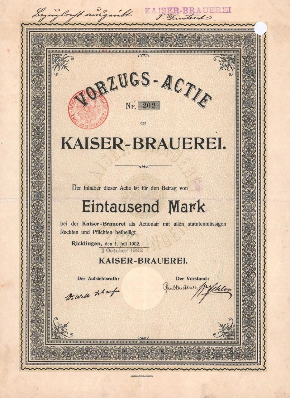 A-63921Kaiser-Brauerei-1Ricklingen19021 azione di preferenza da 1.000 MarchiR5 (101-250 pezzi)S5 (da 251 a 500 €)