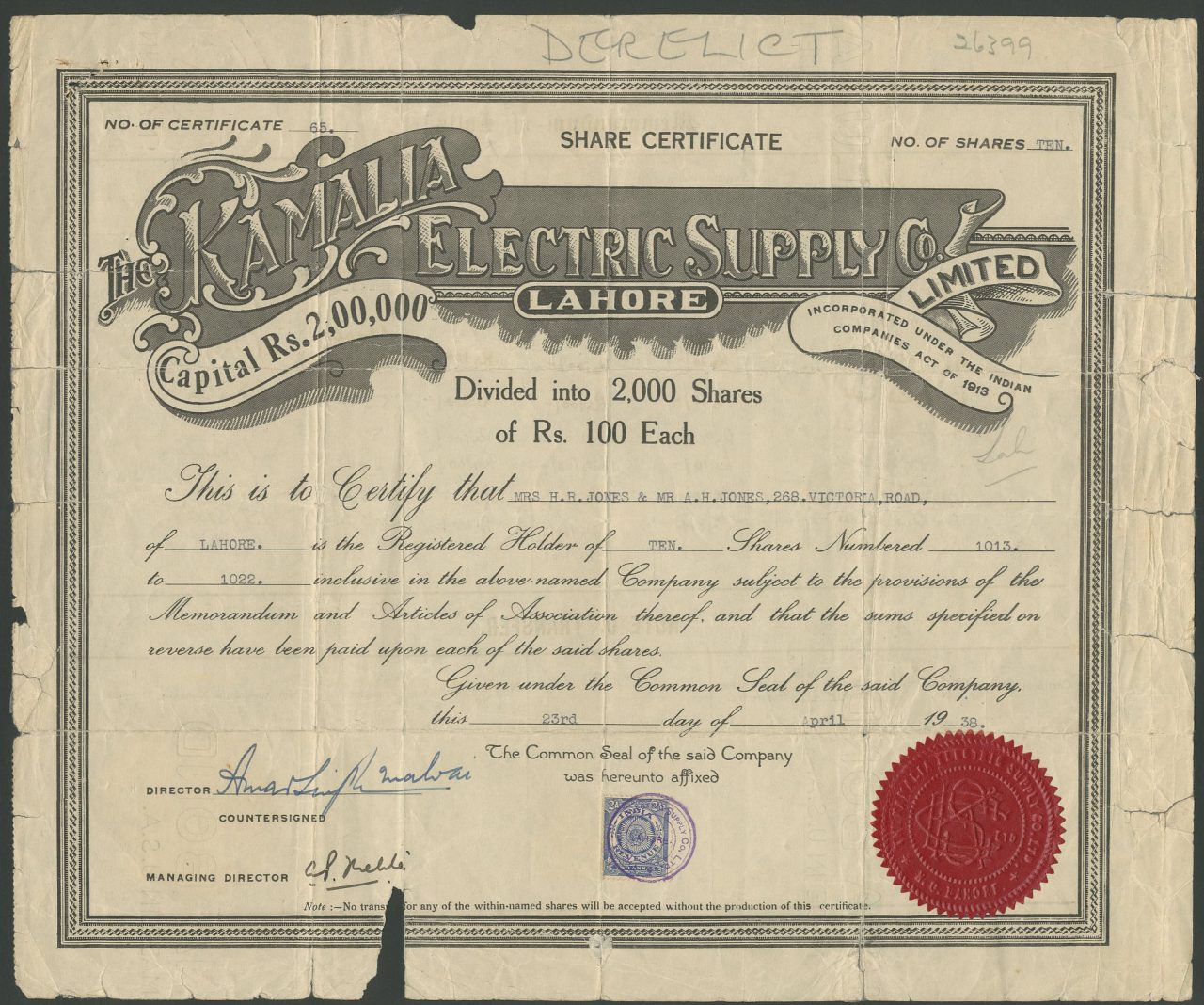 Incorporato sotto l'Indian Companies Act del 1913. Sede principale a Lahore. Capitale 2.00.000 rupie in azioni di 100 rupie.