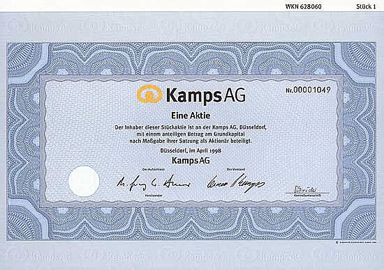 Fondata nel 1997 dalla conversione di BBG Bäckerei-Beteiligungsges. mbH, poi sviluppo fulmineo per diventare un pezzo grosso del mercato azionario: al suo apice, il prezzo dell’azione emessa nel 1998 a € 8,35 è aumentato di oltre cinque volte. Oggi Kamps, con quasi 100 filiali in tutta Europa, è la più grande tra le panetterie e i produttori di prodotti da forno (Lieken, Golden Toast, Harry’s). Solo di recente, dopo una battaglia di acquisizione durata solo pochi giorni, è stata rilevata dal pastificio italiano Barilla, poi spremuto dai piccoli azionisti nel 2006.