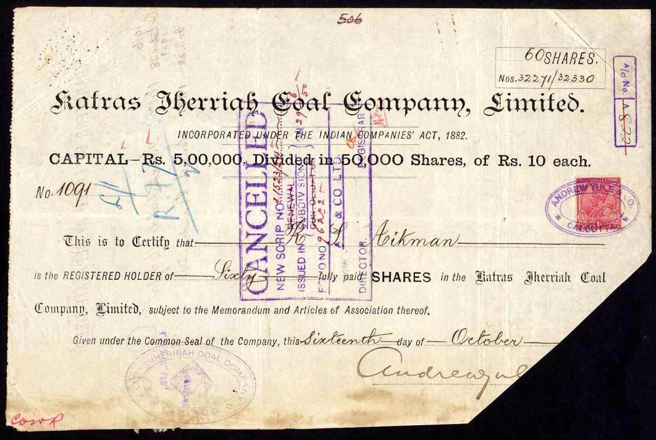 A-42613Katras Jherriah Coal Company Ltd.-1British India192010 rupee sharesR1 (Più di 5000 pezzi)S1 (da 0 a 25 €)