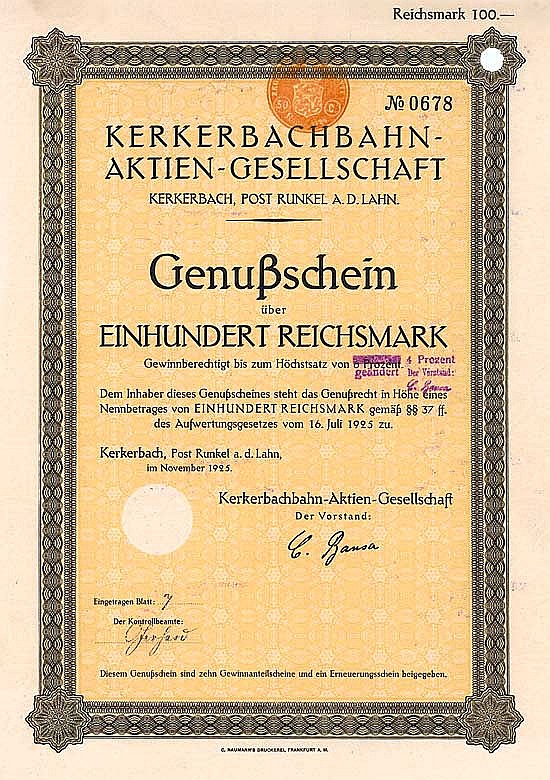 Fondata nel 1884. Ferrovia a scartamento ridotto da 1000 mm Dehrn-Kerkerbach-Heckholzhausen-Hintermeilingen-Mengerskirchen, la tratta Dehrn-Kerkerbach era accessibile anche a scartamento normale grazie a un terzo binario. Collegamento alla Deutsche Reichsbahn a Kerkerbach. L’azienda è stata aperta nel 1886. Con sede a Christianshütte fino al 1906, poi a Kerkerbach (Oberlahnkreis). Una pura ferrovia merci, come già mostra la flotta: 4 locomotive hanno spostato 2 carrozze passeggeri, ma fino a 100 vagoni merci. Nel 1946 trasferimento in proprietà comune (a ovest una particolarità della costituzione dello stato dell’Assia, nel 1953 la socializzazione è stata nuovamente revocata). Nel 1974 cessione di esercizio ferroviario alla Ferrovia Federale, poi solo gestione patrimoniale. Trasferimento a Francoforte (1977), Heidelberg (1979) e Mannheim (1980). La “seconda vita” come promotore immobiliare, alimentata da un boom senza precedenti di modelli di risparmio fiscale, fu di breve durata: in uno spettacolare fallimento, la Kerkerbachbahn precipitò nel 1984, l’ultimo grande azionista e membro del consiglio Tom Sieger respirò aria pulita per alcuni anni.