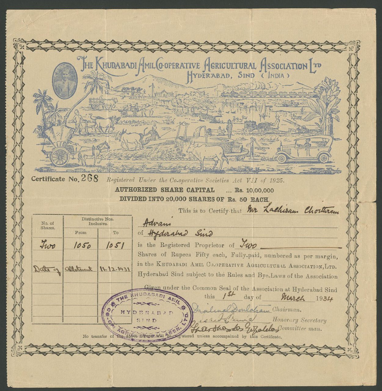 A-43114Khudabadi Amil Co-operative Agricultural Association Limited-1British India193450 rupee sharesR2 (1001-5000 pezzi)S2 (da 26 a 50 €)