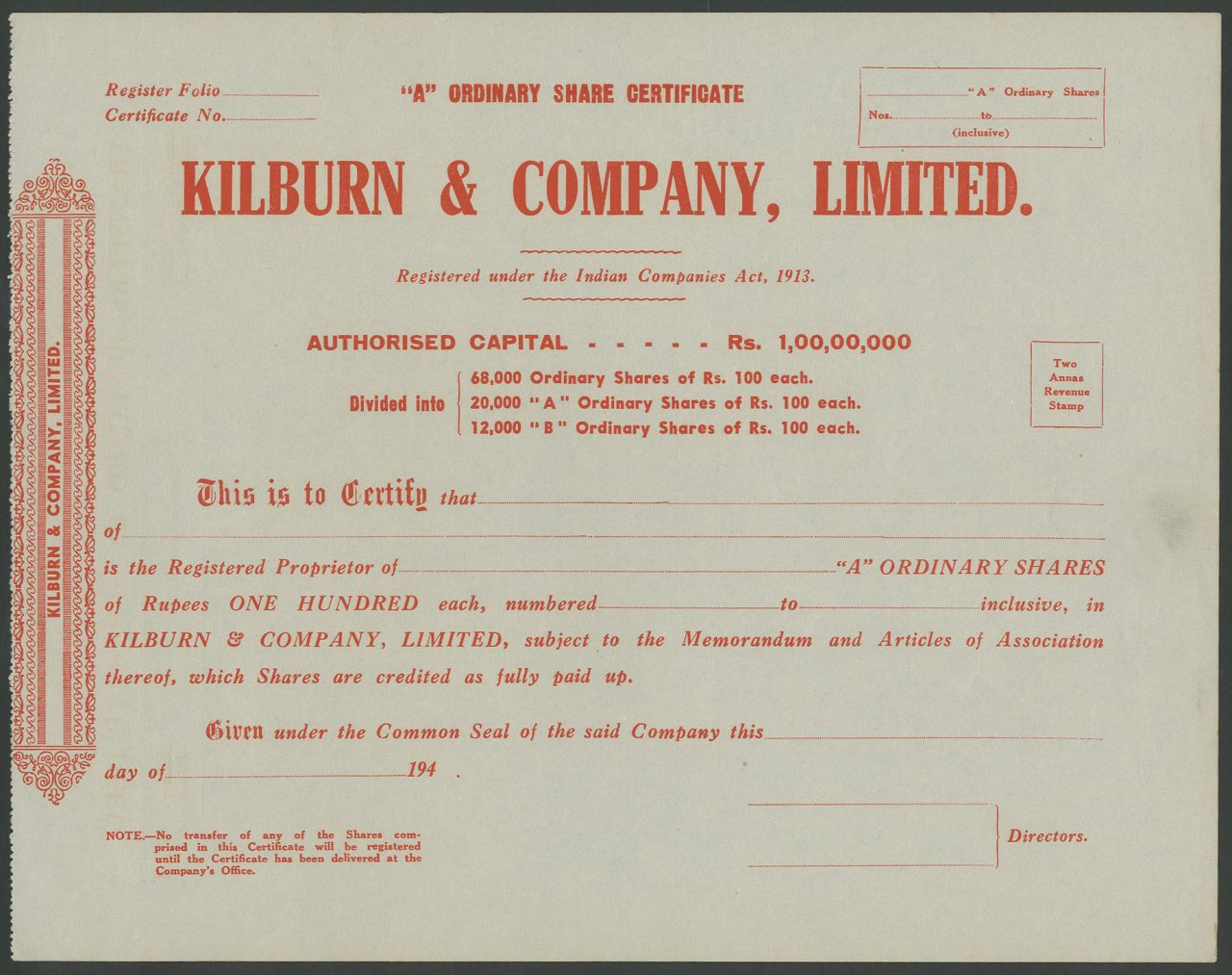 Capitale 1.000.000 di rupie in 68.000 azioni ordinarie da 100 rupie, 20.000 azioni ordinarie "A" da 100 rupie e 12.000 "B; azioni ordinarie da 100 rupie.
