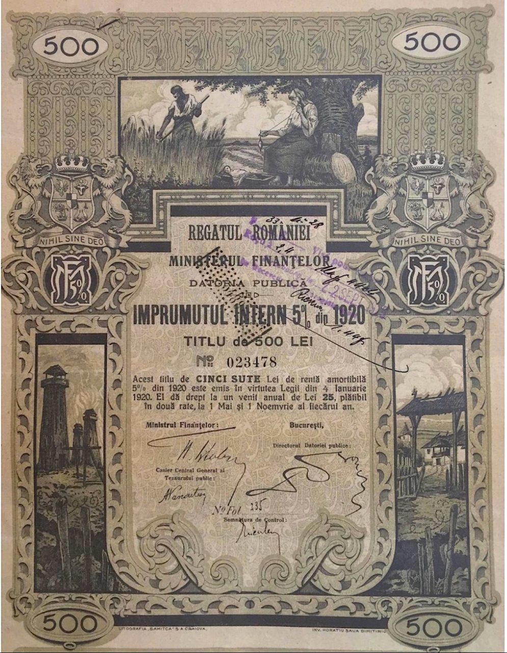 Regatul Romaniei Ministerul Finantelor Datoria PublicaImprumutul Intern 5% din 1920 Titlu de 20,000 Lei Bucuresti