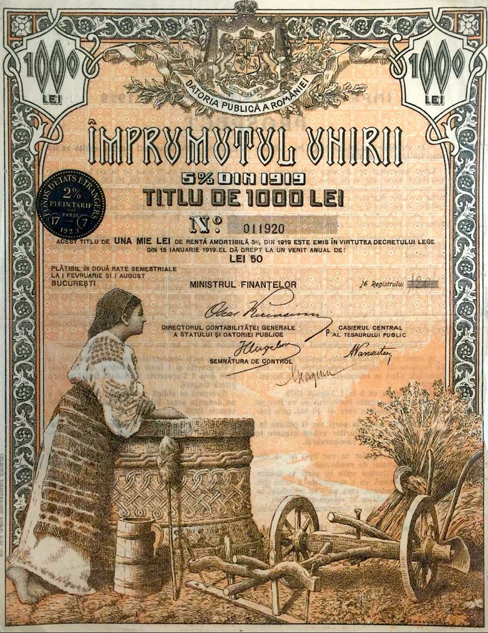 Kingdom of Roumania Loan of 1000 Lei – Public debt Ministry of Finance 1919