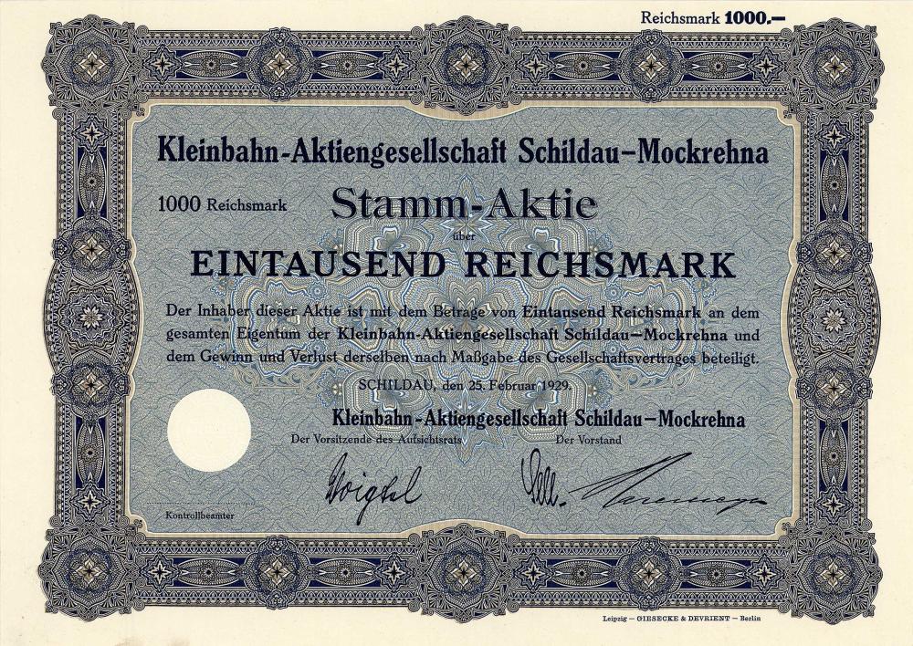 A-63953Kleinbahn-AG Schildau-Mockrehna-1Schildau19291 azione da 1.000 MarchiR4 (251-500 pezzi)S4 (da 101 a 250 €)