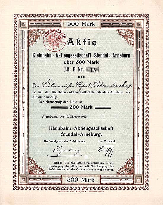 Fondata nel 1898 dallo Stato di Prussia, dalla provincia di Sassonia e dal distretto di Stendal. Linea ferroviaria lunga 12,6 km da Stendal ad Arneburg, aperta nel 1899 con scartamento da 1.000 mm, nel 1913/14 modificata in scartamento normale (1.435 mm). Nel 1924 si è fusa nella Stendaler Kleinbahn-AG (in precedenza Kleinbahn-AG Stendal-Arendsee, dal 1942 Stendaler Eisenbahn-AG). Nel 1946 esproprio e acquisizione da parte della Sächsische Provinzbahnen GmbH, rilevata nel 1948 dalla VVB des Verkehrswessens Sachsen-Anhalt, dal 1 ° aprile 1949 la Stendaler Eisenbahn apparteneva alla Deutsche Reichsbahn. La linea Stendal-Arneburg è stata chiusa per tutto il traffico nel 1972, ma non per sempre: parte della linea è stata utilizzata dal 3.1.1977 per la linea Bors... Altro