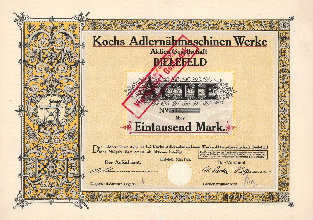 Fondata nel 1860, dal 1895 AG come "fabbrica di macchine da cucire e fonderia di ferro precedentemente H. Koch & Co." Nel 1931 acquisizione del programma di produzione per le macchine da cucire per uso domestico Dürkopp. Nel 1971 cambio di nome in Kochs-Adler AG, chiusura del 1975 della fonderia di ferro. Nel 1977 la fabbrica di macchine per cucire industriali si trasferì in una nuova fabbrica alla periferia di Bielefeld, la produzione di macchine per cucire per uso domestico terminò nel 1979. Per molto tempo, la famiglia Oetker di Bielefeld è stata un importante azionista della AG, quotata in borsa fino alla fine, negli anni '80 la maggioranza è andata a FAG Kugelfischer Georg Schäfer KGaA a Schweinfurt. All'inizio degli anni '90, Kochs Adler è stata ri... Altro