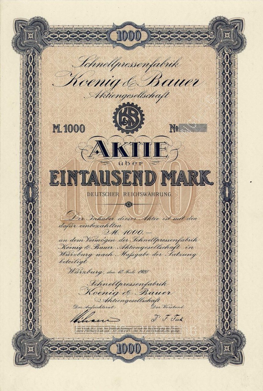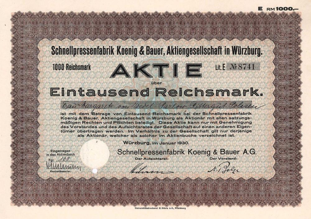 Fondata nel 1817 come la più antica fabbrica di macchine da stampa al mondo da Friedrich Koenig (1773-1833), l’inventore della macchina da stampa ad alta velocità. AG dal 1920. Nel 1995 fusione con la pressa Albert Presse a Frankenthal (Palatinato). Koenig e Bauer ottennero il colpo di stato più grande dopo l’inversione di tendenza con l’acquisizione dell’azienda ammiraglia della DDR Planeta a Radebeul: da un lato, riuscì a posizionarsi direttamente contro il concorrente del minerale Heidelberger Druckmaschinen nel campo delle macchine da stampa a foglio. D’altra parte, Koenig & Bauer non deve pagare alcuna imposta sul reddito fino a molto tempo dopo la svolta del millennio a causa della gigantesca perdita portata avanti nonostante la brillante situazione degli utili.