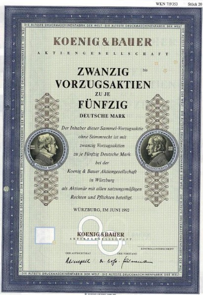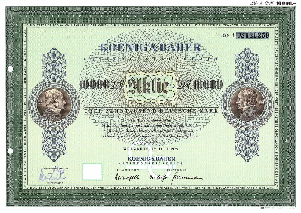 Fondata nel 1817 come la più antica fabbrica di macchine da stampa al mondo da Friedrich Koenig (1773-1833), l'inventore della macchina da stampa ad alta velocità. AG dal 1920. Nel 1995 fusione con la pressa Albert Presse a Frankenthal (Palatinato). Koenig e Bauer ottennero il colpo di stato più grande dopo l'inversione di tendenza con l'acquisizione dell'azienda ammiraglia della DDR Planeta a Radebeul: da un lato, riuscì a posizionarsi direttamente contro il concorrente del minerale Heidelberger Druckmaschinen nel campo delle macchine da stampa a foglio. D'altra parte, Koenig & Bauer non deve pagare alcuna imposta sul reddito fino a molto tempo dopo la svolta del millennio a causa della gigantesca perdita portata avanti nonostante la brillante situazione degli utili.