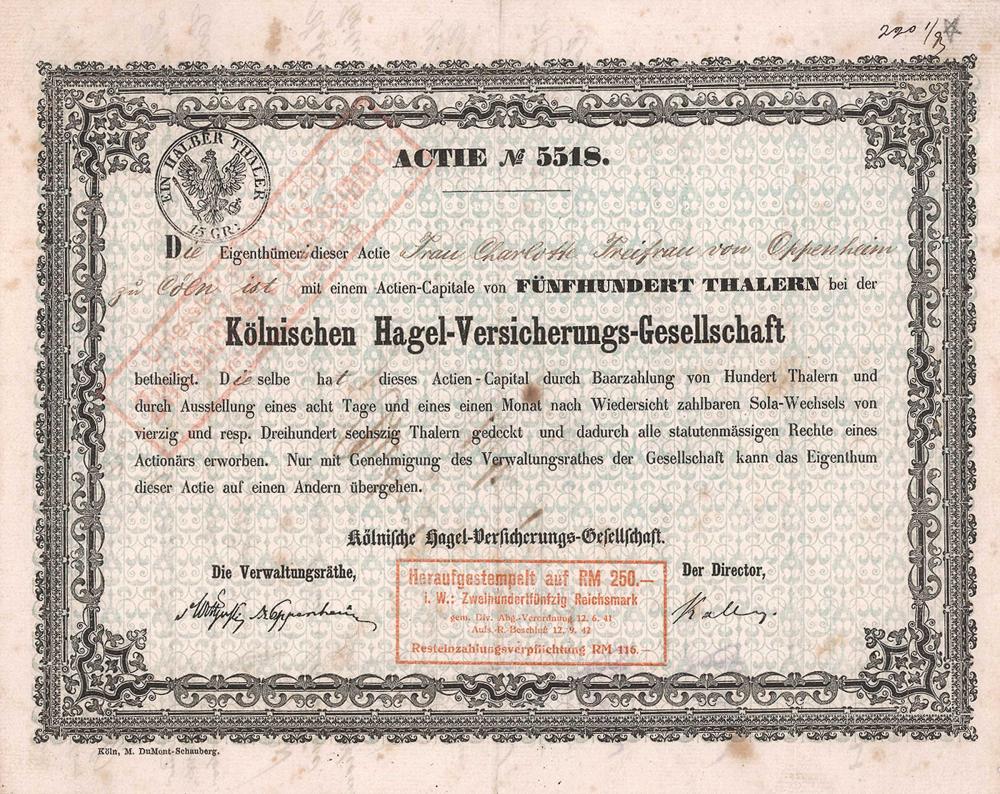 La famiglia bancaria von Oppenheim (firma facsimile anche sul titolo) ha influenzato sin dall’inizio le fortune dell’azienda. Nel 1936 acquisizione di una partecipazione nella Hagel-Assecuranz-Gesellschaft di Berlino dal 1832, che fu poi rilevata per intero nel 1966 (acquisizione) o nel 1972 (fusione). Nel 1972 viene incorporata nella Colonia Versicherung AG a Colonia dopo aver gradualmente acquisito il 100% delle azioni.