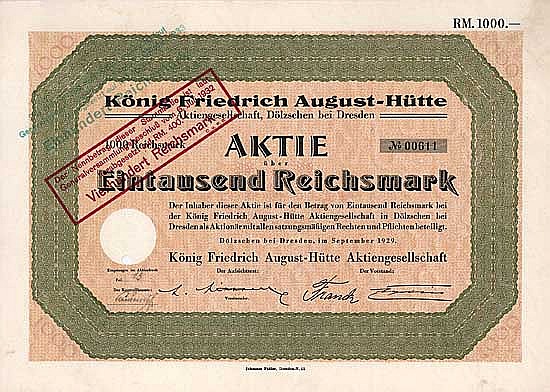 Fondata nel 1789 come Hüttenwerk, AG dal 1881. Fabbricazione di prodotti fusi, macchine e apparecchi di ogni tipo. Nel 1922 l’azienda si è fusa nella proprietà della Sächsische Maschinenfabrik vorm. Hartmann, Chemnitz (nel 1928 riconversione della capanna nella propria AG). Nel 1931 acquisizione dell’intera azienda delle officine meccaniche di Dresda C. E. Rost & Co. Nel 1934 acquisizione della fonderia della Hille-Werke AG, Dresda. Dopo l’espropriazione nella DDR, la fabbrica è stata continuata come VEB Eisenhammerwerk Dresden-Dölzschen, produzione di prodotti fusi per la produzione di veicoli. Acquistata dalla Treuhand dopo la privatizzazione nel 1990 dagli ex dipendenti, oggi produttrice di getti per la costruzione di canali.