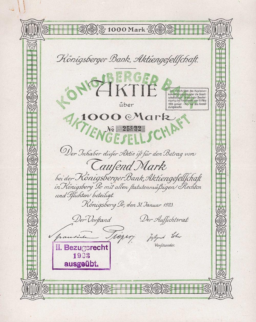 A-61146Königsberger Bank AG-1Königsberg19231 azione da 1.000 MarchiR2 (1001-5000 pezzi)S2 (da 26 a 50 €)