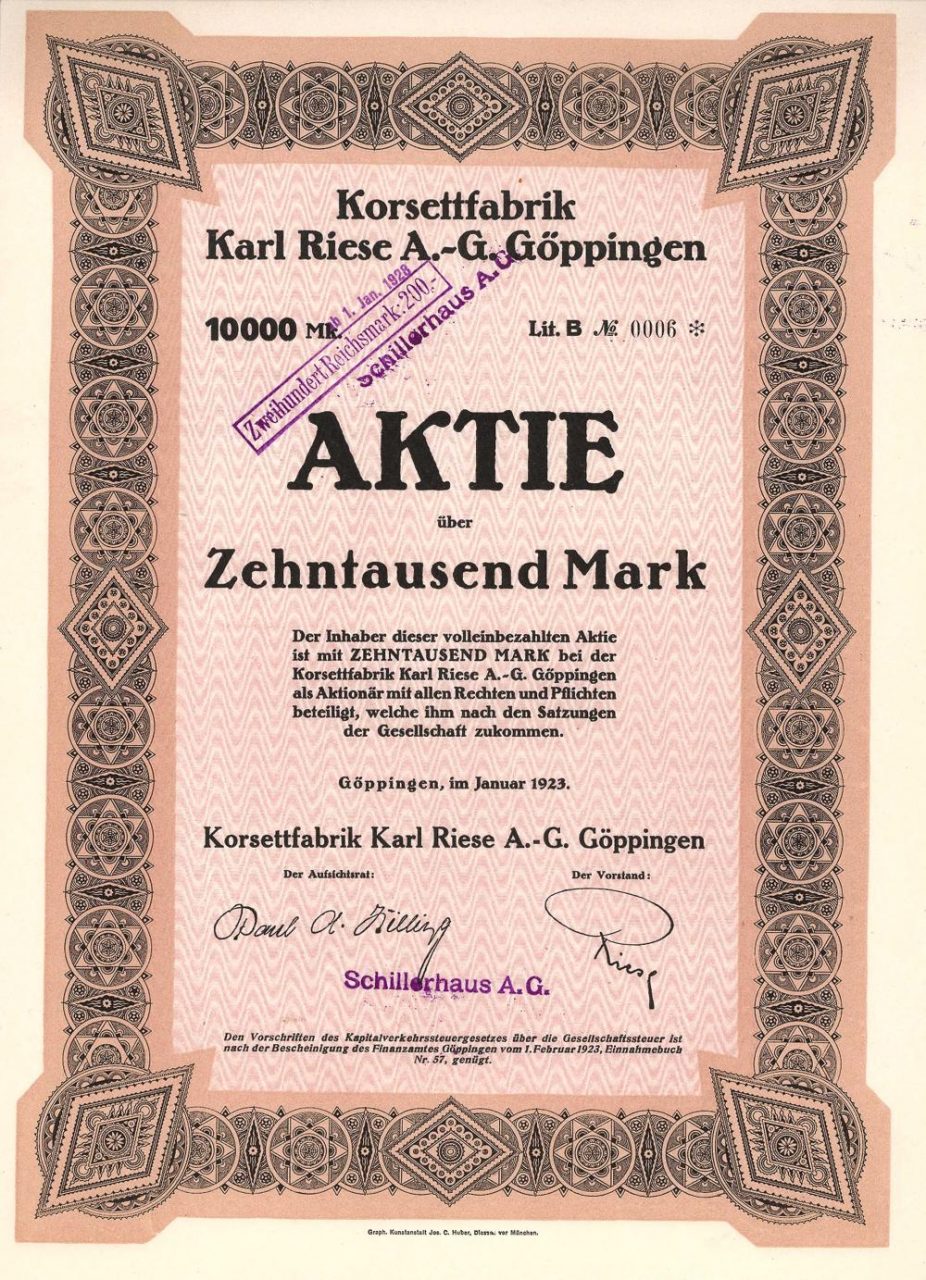 Fondata nel 1922. Dopo la chiusura della fabbrica di corsetti, solo la proprietà in Geislinger Str. 26 e la Schillerhaus furono affittate. Nel 1927 modifica del nome in “Schillerhaus AG”.