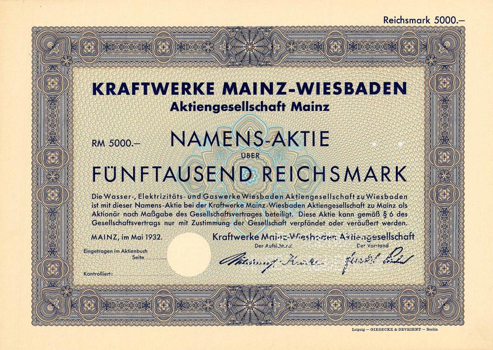 Le centrali elettriche Mainz-Wiesbaden furono create nel 1931 dalla fusione delle centrali elettriche di Wiesbaden e Mainz. Oggi è un'azienda energetica regionale a Magonza con circa 400 dipendenti. Genera elettricità con due impianti del gas nella sede di Ingelheimer Aue a Magonza. Inoltre, fornitore di vapore e teleriscaldamento da cogenerazione per aziende industriali della regione. L'azienda è di proprietà dei servizi pubblici di Mainz e della fornitura di ESWE.