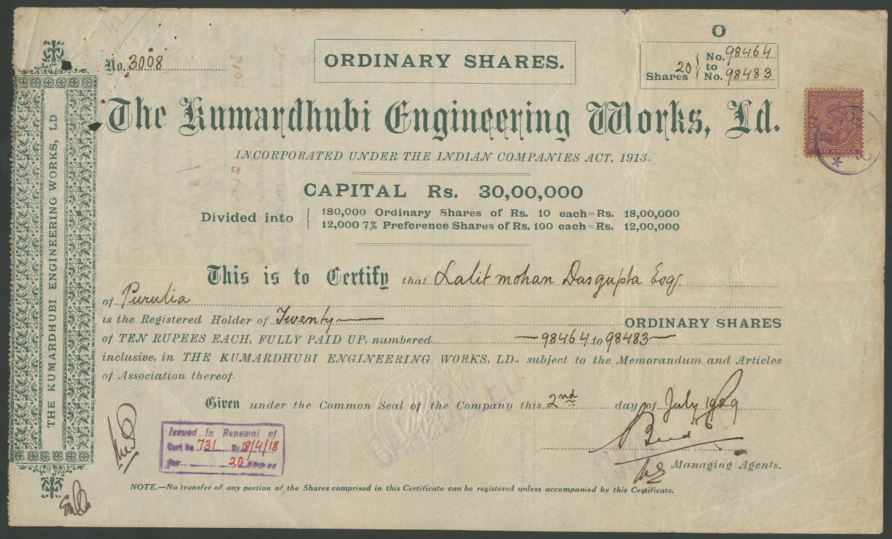 A-43174Kumardhubi Engineering Works Limited-1British India1920ordinary sharesR1 (Più di 5000 pezzi)S1 (da 0 a 25 €)
