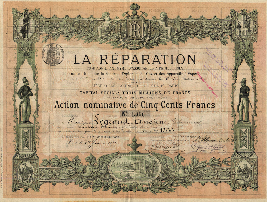 B-35899La Reparation – Compagnie Anonyme d’Assurances a Primes fixes contre l’Incendie, la Foudre, l’Explosion du Gaz et des Appareils a Vapeur-2Francia1882azione nominativa di 500 FFR3 (501-1000 pezzi)S3 (da 51 a 100 €)