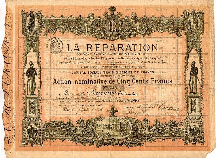 B-35899La Reparation – Compagnie Anonyme d’Assurances a Primes fixes contre l’Incendie, la Foudre, l’Explosion du Gaz et des Appareils a Vapeur-2Francia1882azione nominativa di 500 FFR3 (501-1000 pezzi)S3 (da 51 a 100 €)